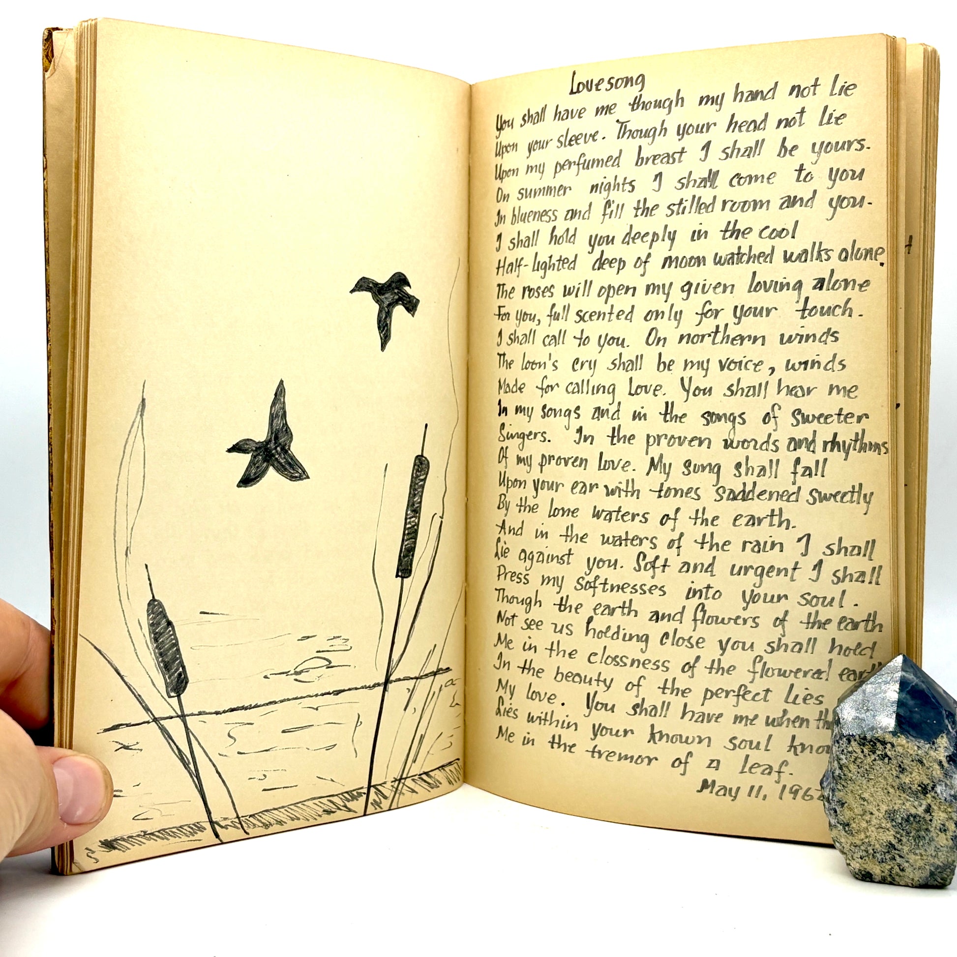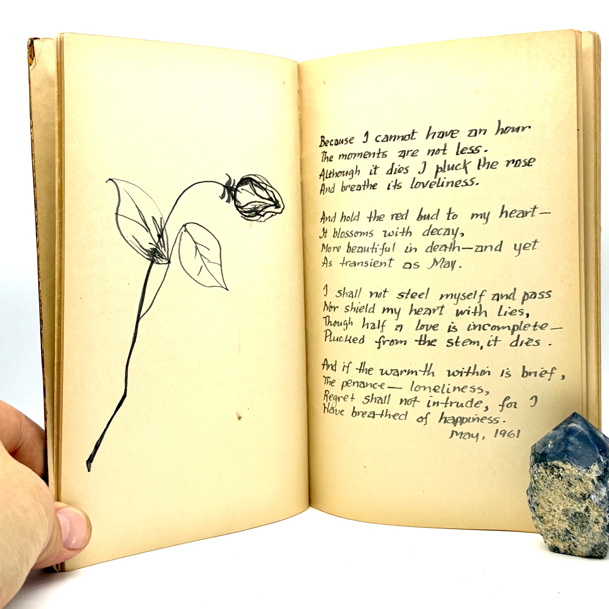Illustrated handwritten poetry manuscript book, n.d. (internal dates 1960–1966). Oblong octavo (7.75 x 5 inches). 56 pages of handwritten poetry, followed by 3 blank leaves at rear. Illustrated with 9 original hand-drawn illustrations by the author, integrated throughout the text. Bound in a small notebook format with marbled paper-covered boards; the front board bears a watercolor-style paper onlay serving as the title label. The handwritten title page features two dried violet blossoms affixed. A translucent floral-patterned decorative paper is affixed inside the front cover and serves as a frontispiece. Light handling wear and age-toning to paper; boards with minor wear; translucent frontispiece lightly toned; dried botanical elements intact. Very Good.