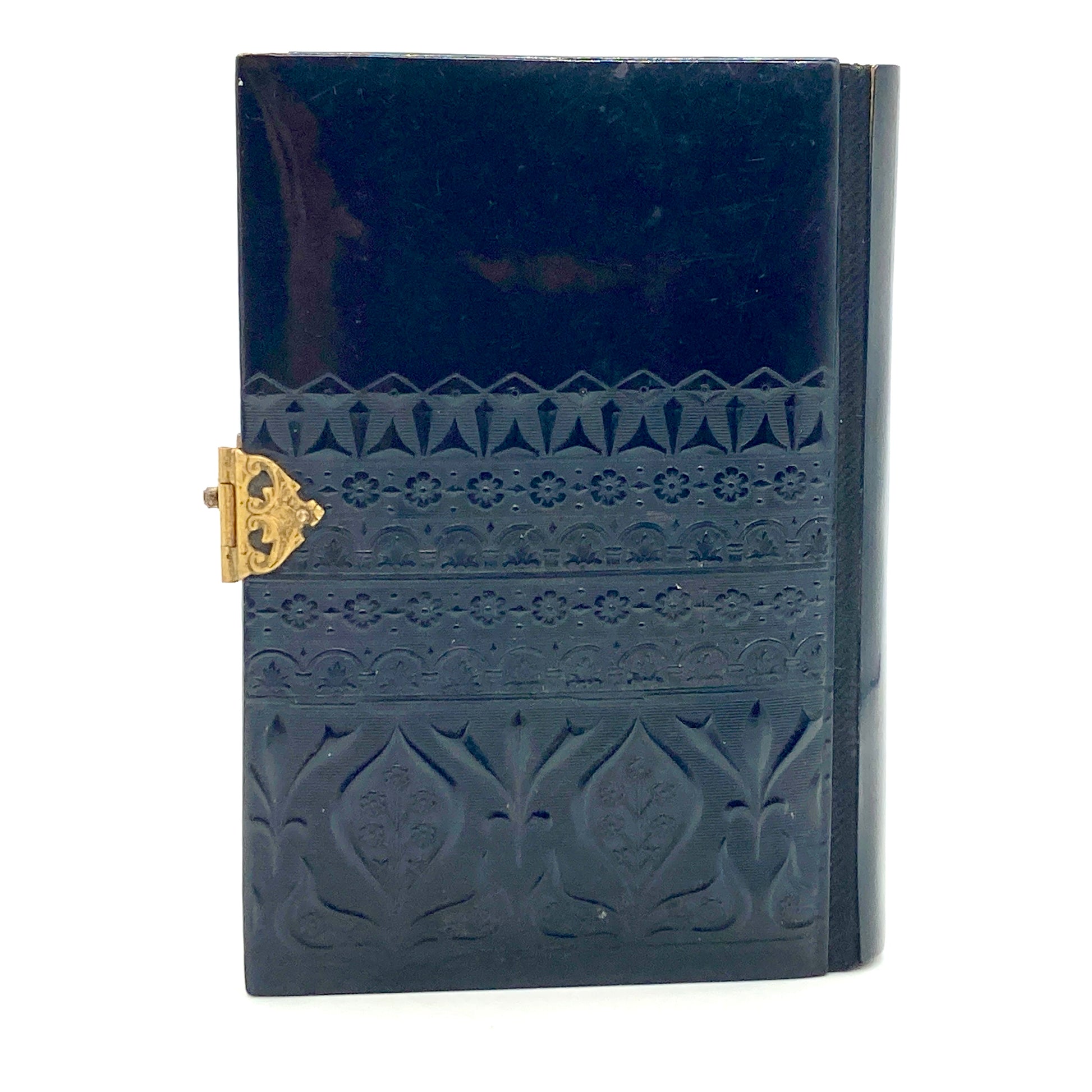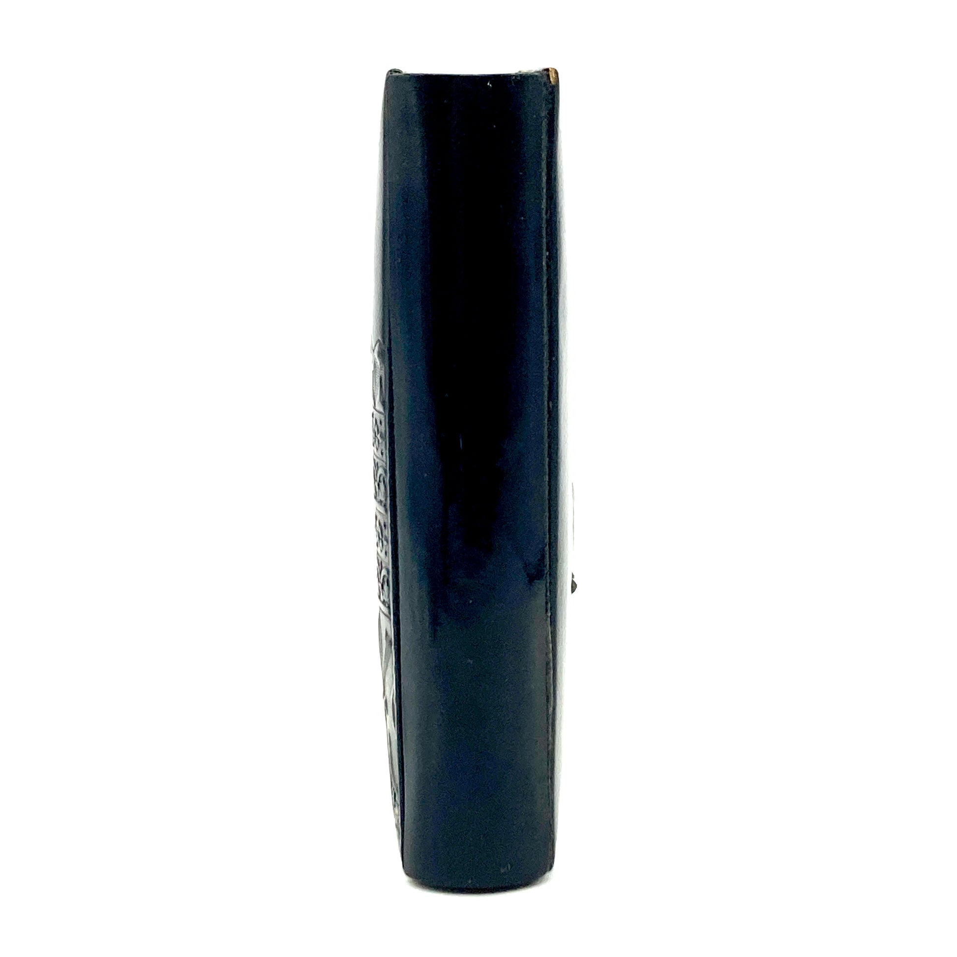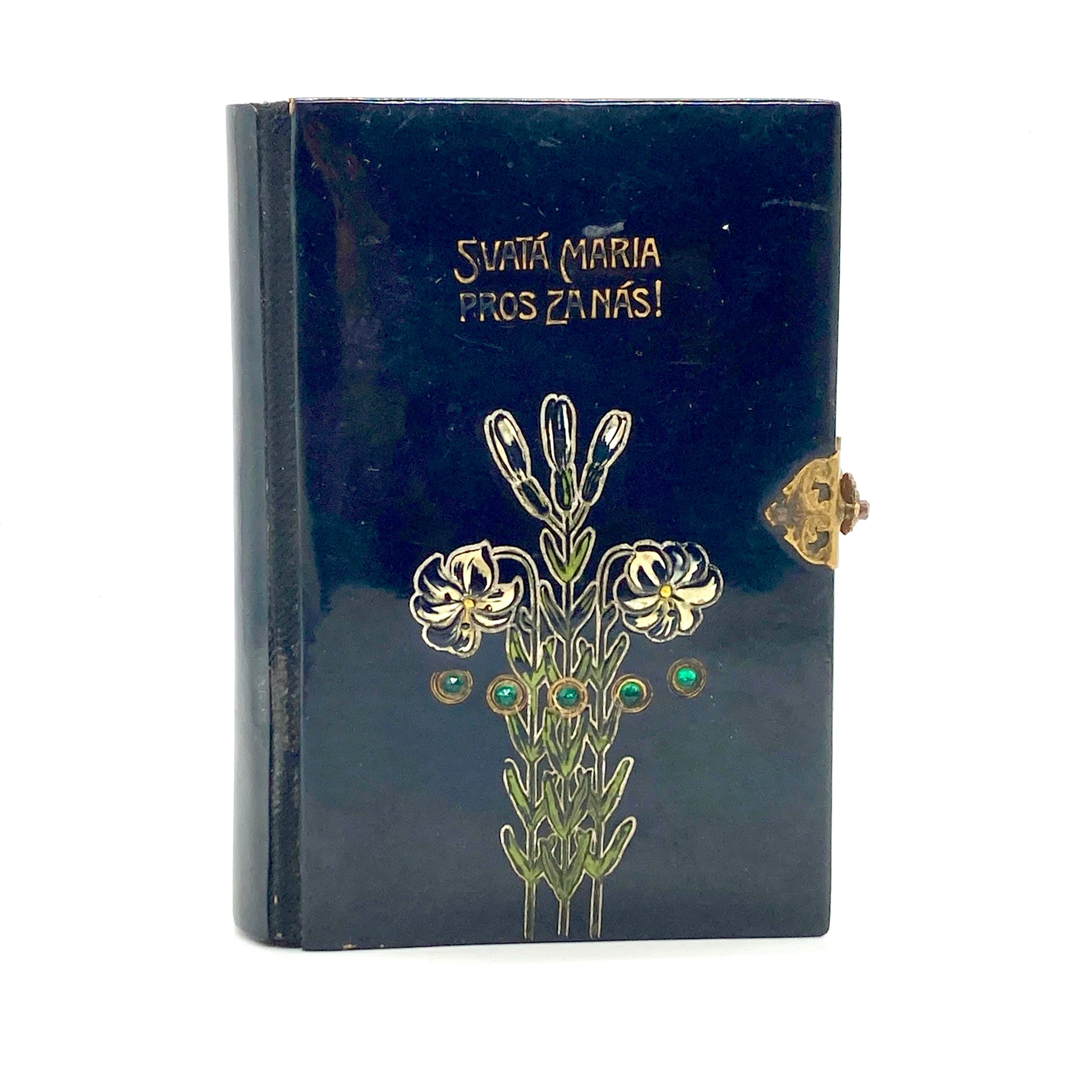 "Maria Kralovna Nebeska: Modlitební Knížka pro Katolické Křesťany" [A.J. Cellerina a Syna, Praha Vinohrady, 1893]. 319pp. Small 16mo. Bound in glossy black celluloid over boards with a decorative metal clasp, inset with five green glass jewels and a floral pattern. Gilt edges. Chromolithograph frontispiece and lithographic title page. Light age toning to paper, minor wear to endpapers, but binding tight and all pages present. Very Good.