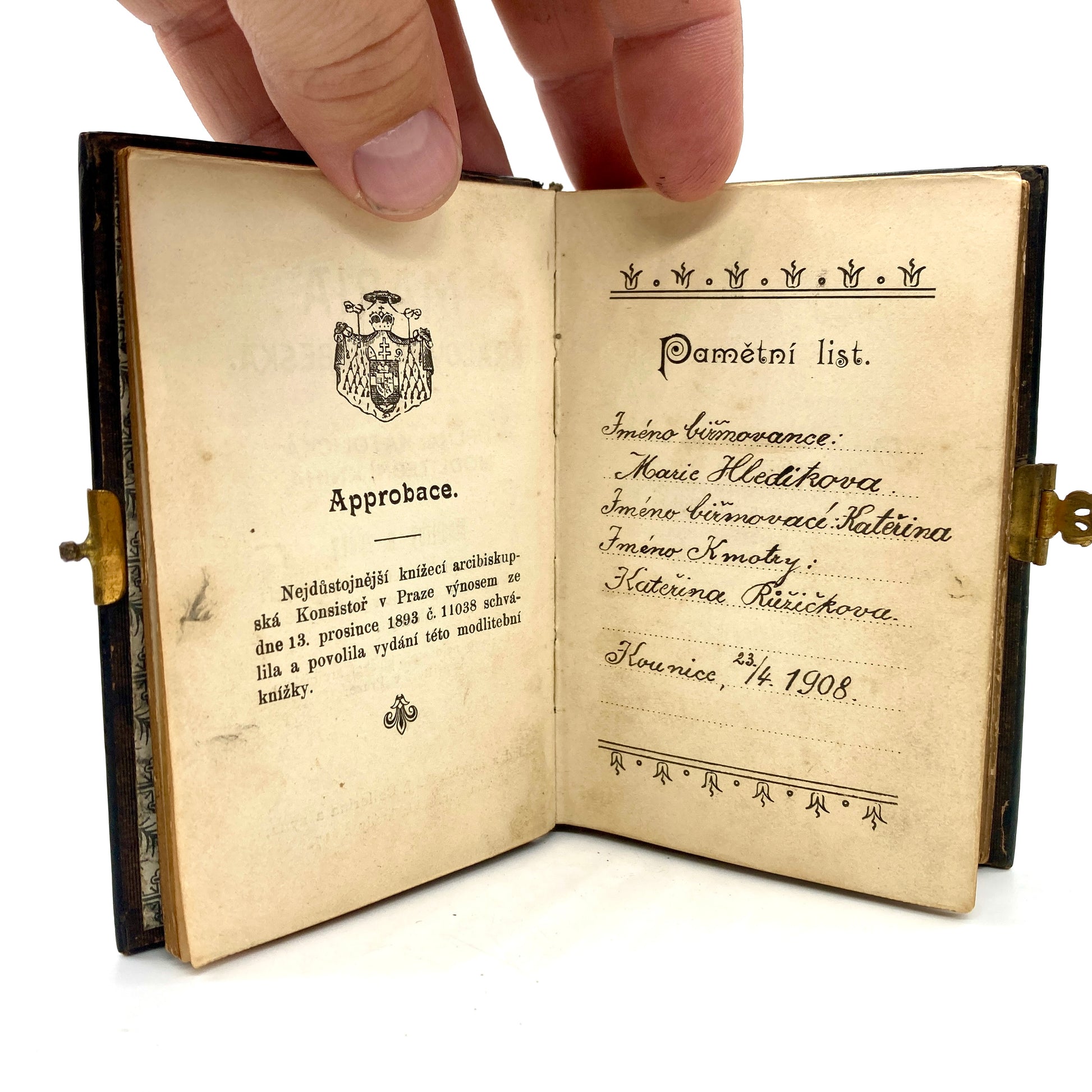 A richly ornamented Czech-language Catholic prayer book, issued in Prague near the end of the 19th century. The elaborate celluloid binding and jeweled clasp mark this as a personal devotional object, likely gifted or purchased for a special occasion. Text entirely in Czech, with no illustrations beyond the title and frontis. A finely preserved example of Central European devotional publishing from the late Austro-Hungarian period.