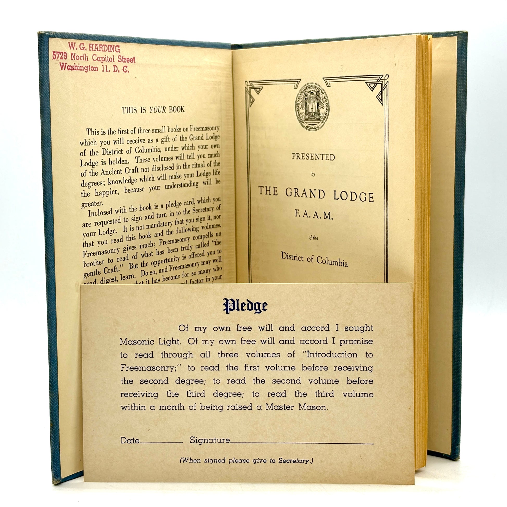 Washington, D.C.: The Temple Publishers, 1945. Three volumes. 7.5" x 5.25", 182pp. Original publisher’s uniform blue cloth, spines lettered in black. Presented by the Grand Lodge, F.A.A.M., of the District of Columbia, with printed presentation leaf and original printed pledge card laid in. Ownership stamp to front pastedown of Volume I reading “W. G. Harding, 5729 North Capitol Street, Washington 11, D.C.” Signature of the Secretary C.H. Bair in the latter two volumes. Light rubbing and mild fading to cloth, spine ends gently bumped, bindings sound and square; contents clean with light, even age toning. Very Good.