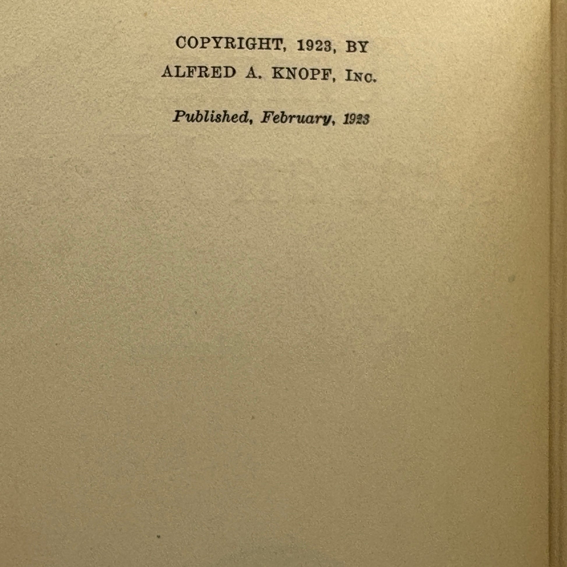New York: Alfred A. Knopf, 1923. First American edition. 7.75" x 4.75", 250pp. Original yellow cloth with blue spine label; publisher’s Borzoi device on title page. Top edge stained blue. Housed in the original illustrated dust jacket. Jacket with notable chipping and loss at spine ends and folds, general age-toning and surface wear; cloth lightly soiled; contents clean. Very Good in a Good dust jacket.