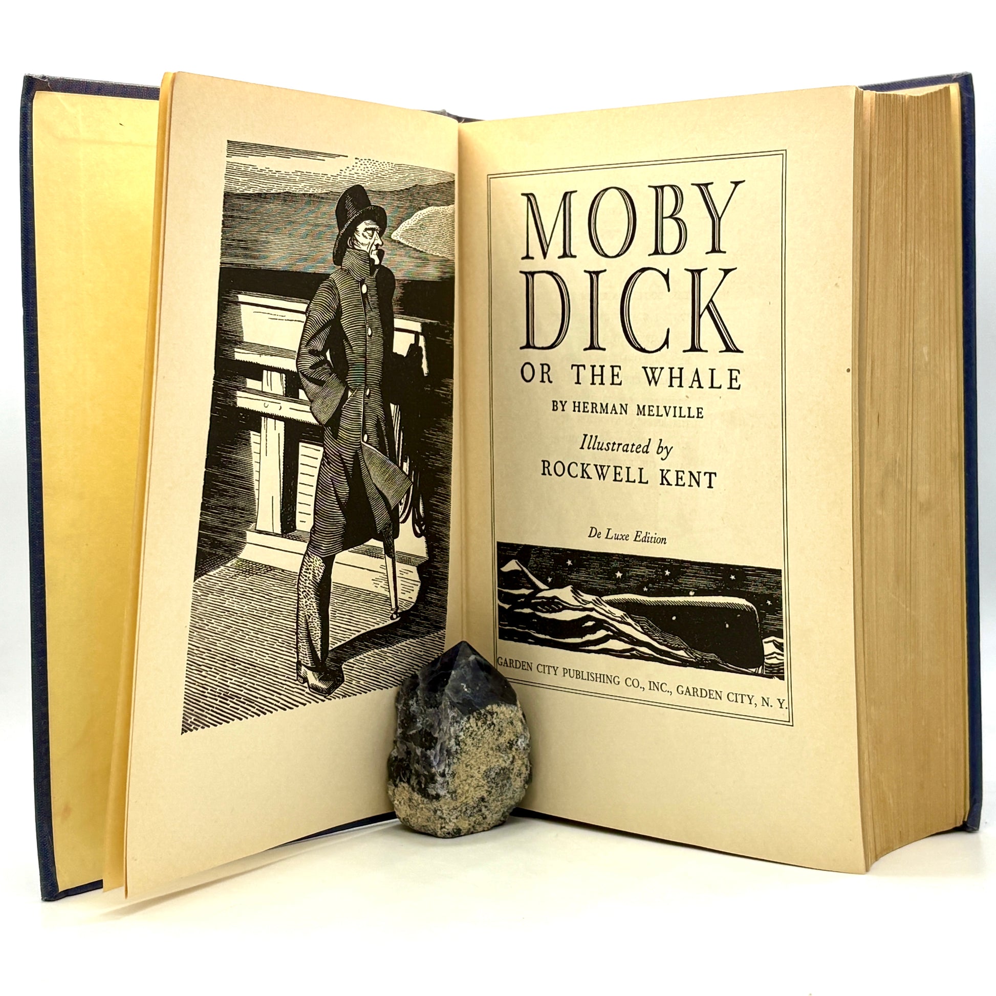 Garden City, NY: Garden City Publishing, 1937. De Luxe edition. 8" x 5.75", xxxi + 827pp with illustrations by Rockwell Kent throughout. Blue cloth with gilt whale decoration on front cover. Lacking dust jacket. Spine face sunned, address label inside front cover, and several chips out of top edge of pg 117/118 from forgotten bookmark. Margins mildly toned. Binding secure. Very Good-.