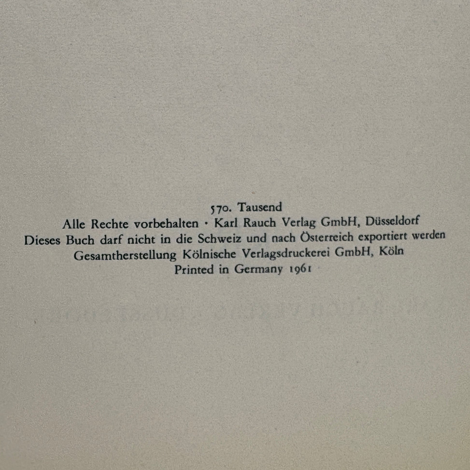 Düsseldorf: Karl Rauch Verlag, 1961. 570th thousand. 8.75" x 6.75". Original yellow cloth, front cover and spine stamped in red with vignette of the Little Prince; pictorial endpapers. Illustrated throughout with the author’s color drawings. Scattered foxing to cloth, most visible on upper cover; spine lightly toned; corners gently bumped. Jacket also foxed, as pictured. Internally clean and bright, with only faint age toning to margins; binding sound and square. Very Good in Very Good- jacket.
