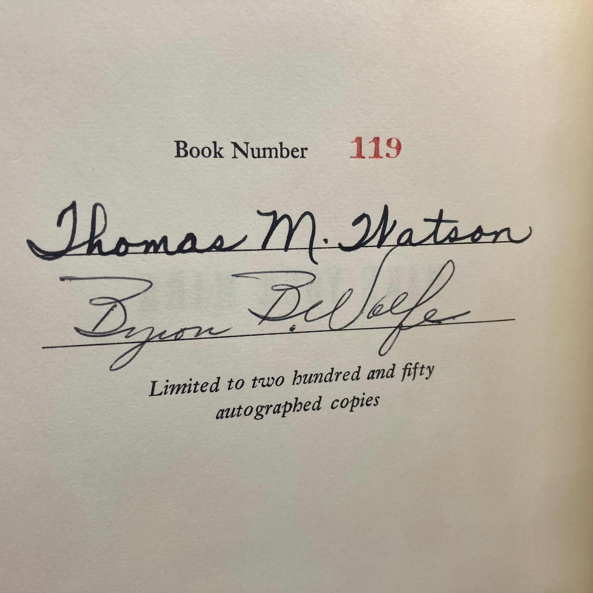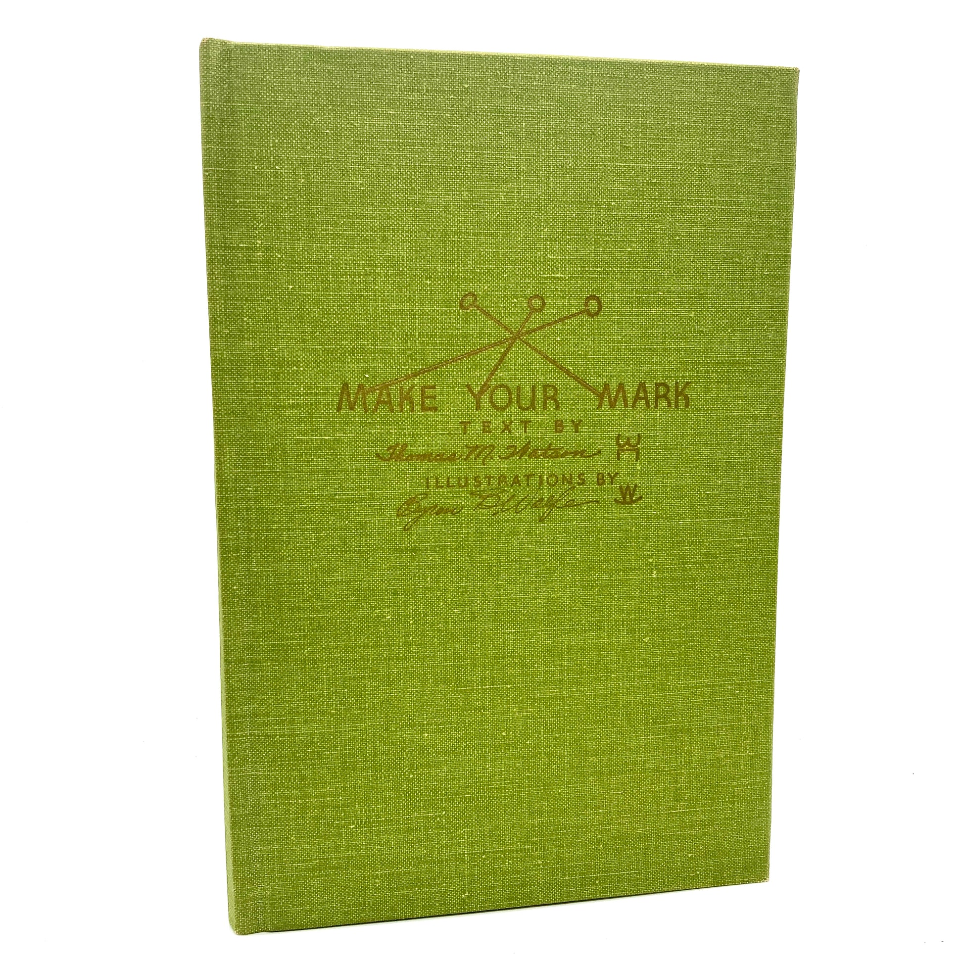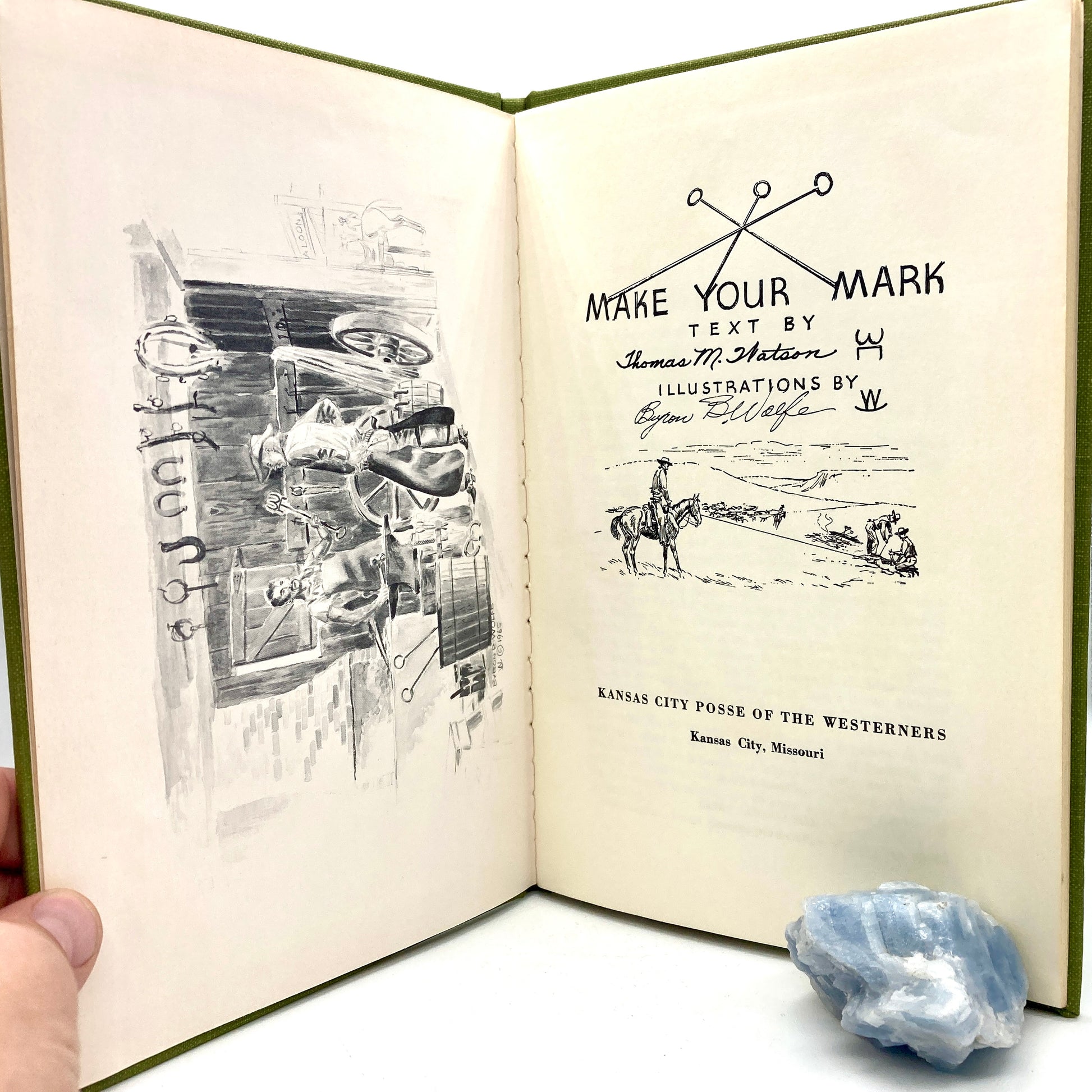 "Make Your Mark" with text by Thomas M. Watson and illustrations by Byron B. Wolfe [Kansas City Posse, n.d./1965]. #119 out of 250 autographed copies with signatures from both Watson and Wolfe. Illustrated throughout with different cattle brands. Frontispiece showing a blacksmith and cowboy discussing a branding iron under construction. 27pp. No dust jacket. Bookplate inside front cover. Very minimal wear. Near Fine.