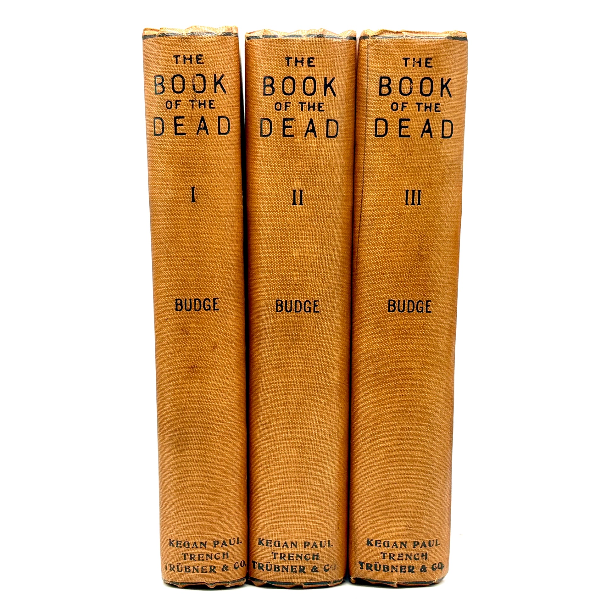 London: Kegan Paul, Trench, Trübner & Co., Ltd., 1910. Complete in three volumes. 7.75" x 5.5", lxviii + 797pp. Original publisher’s brown cloth, spines lettered in black with volume designations I–III; upper boards ruled and decorated in black, with series title “Books on Egypt and Chaldaea.” Bindings solid, with moderate edge wear and rubbing to extremities; light fraying at spine ends and mild darkening to cloth. Internally clean overall, with light toning and occasional spotting consistent with age; text and hieroglyphs clear and legible throughout. Very Good.