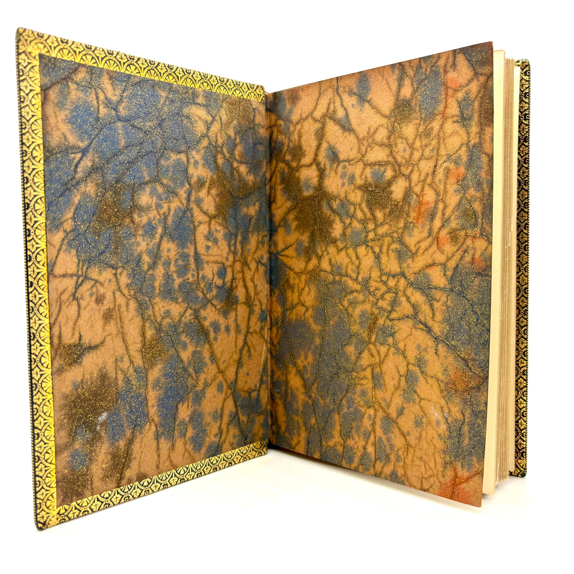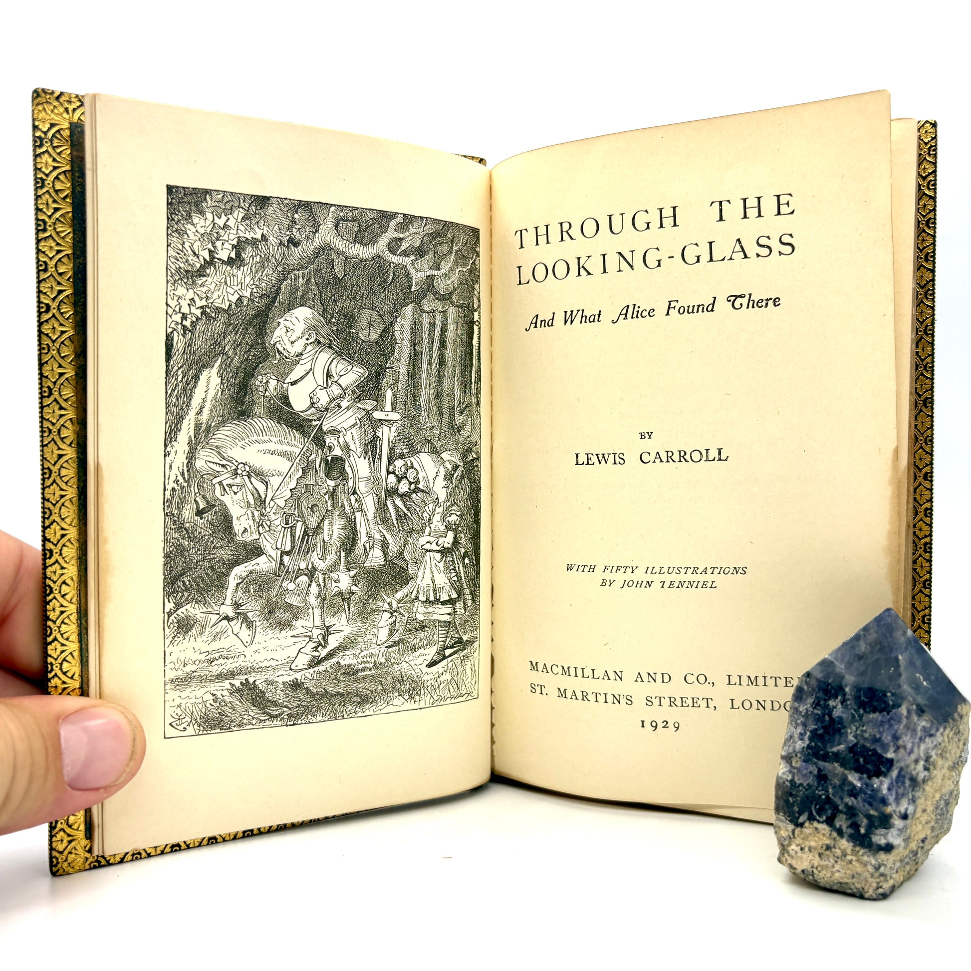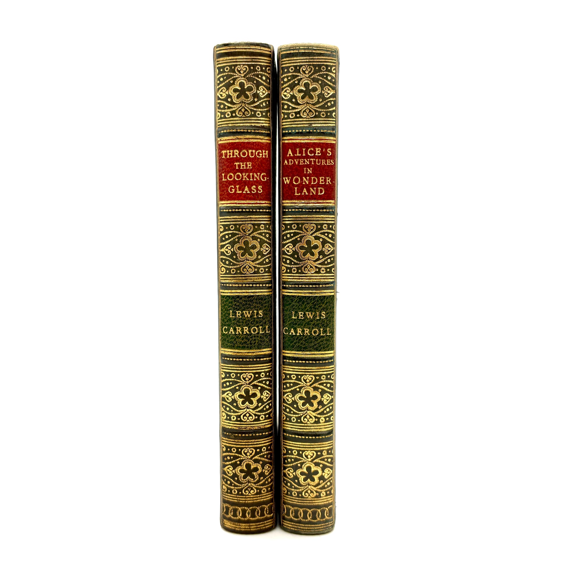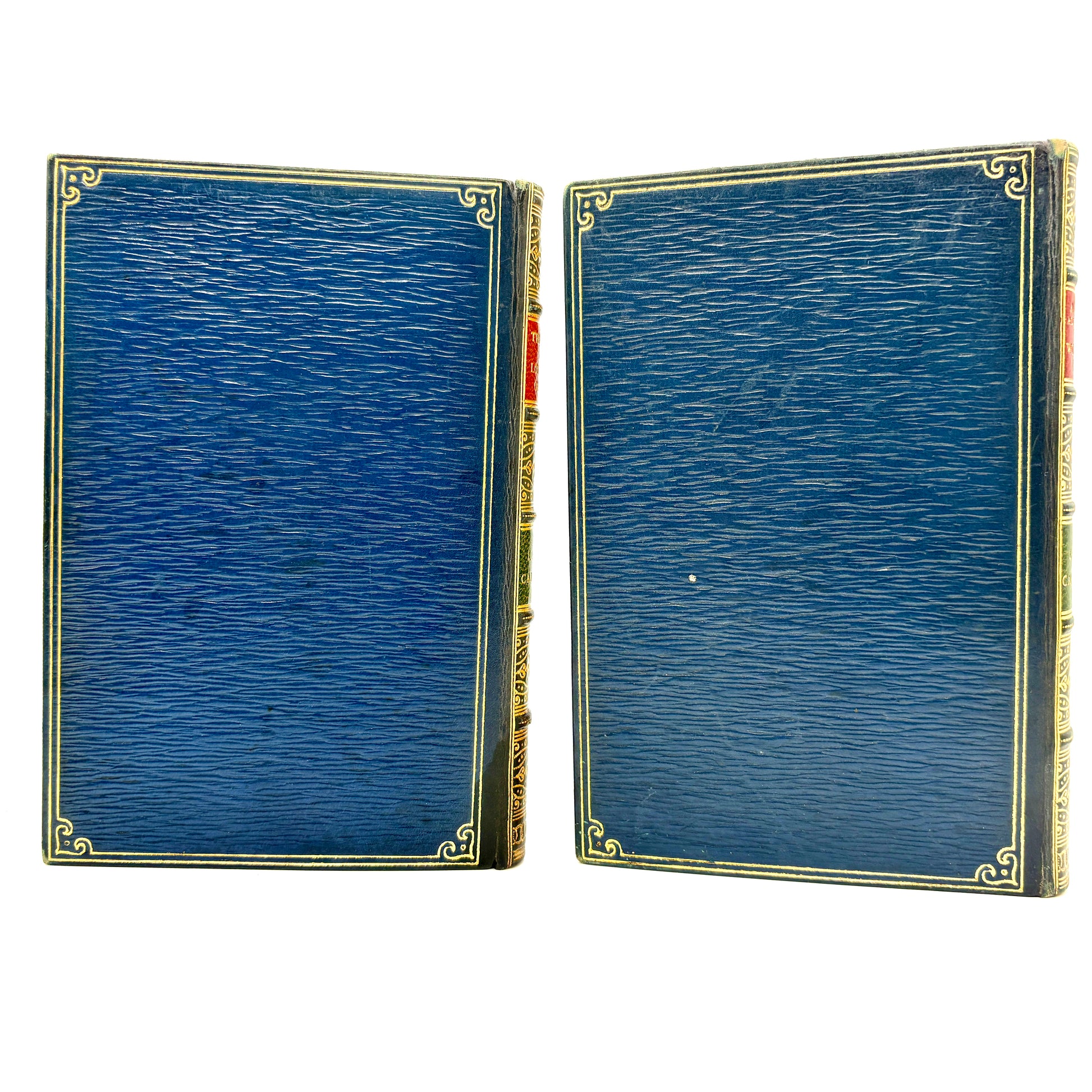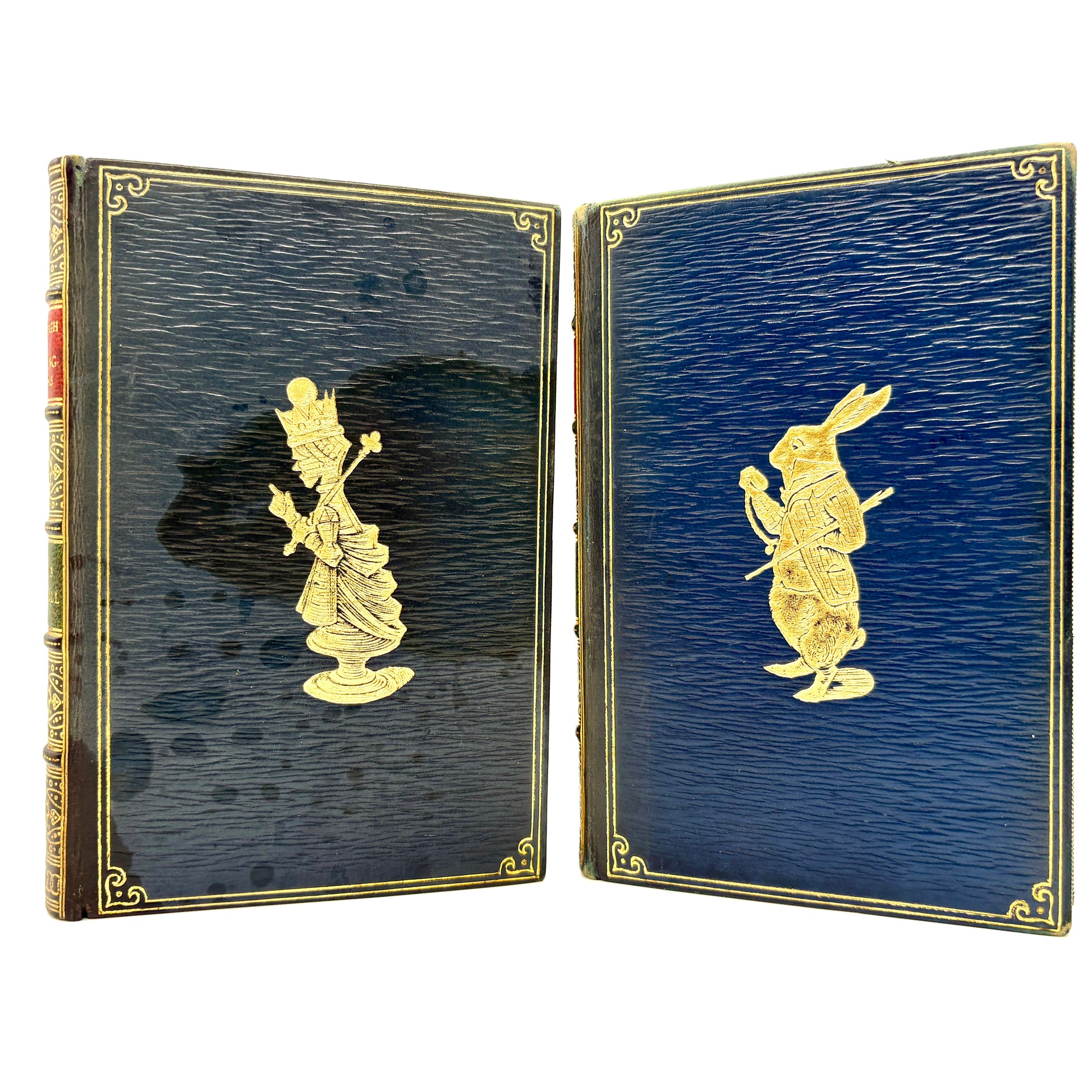 London: Macmillan and Co., Limited, 1929. Complete in two volumes. 6" x 4.25", 200pp + xi + 229pp with 92 total illustrations in black & white by John Tenniel. Blue straight-grain leather, gilt ruled with gilt characters on each front cover. Bound by Riviere and Son. Red morocco spine labels, five raised bands, and extensive gilt decoration. Marbled endpapers and gilt dentelles. All edges gilt. Discoloration to the front board of Looking-Glass, as pictured. Title page of same is pulling away at lower half. Textblocks clean and bindings tight. Very Good.