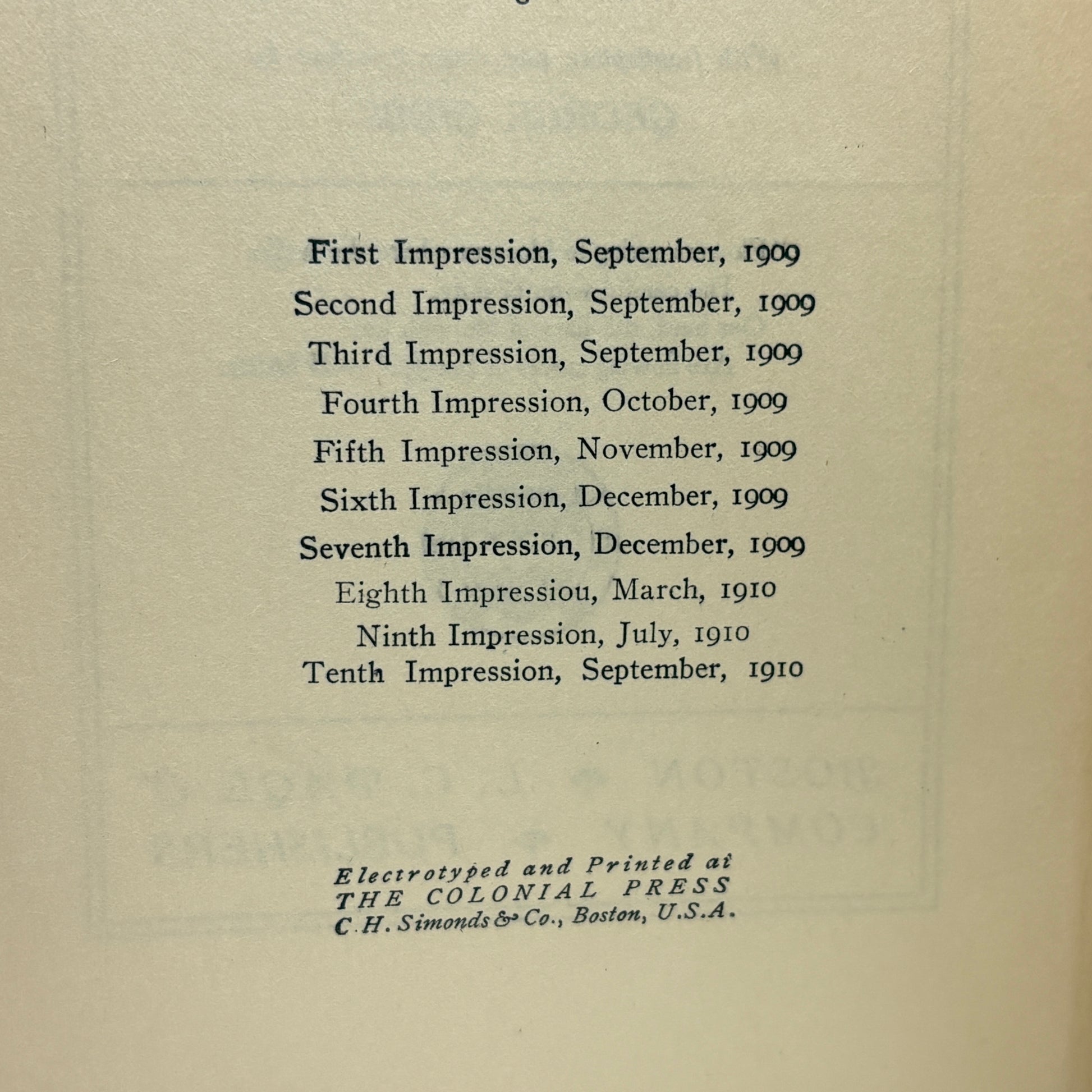 Boston: L. C. Page & Company, 1910. Tenth impression. 7.75" x 5.5", viii + 367pp + 7pp publisher's catalogue. Teal cloth, gilt-stamped spine and front cover, with mounted color portrait panel on the front cover. With frontispiece and cover in colour by George Gibbs. Cloth shows rubbing and wear at extremities (notably corners and spine ends), scattered spotting/soiling to the boards, and general handling wear. Text block toned with visible foxing/spotting. Spine slightly cocked and front hinge starting, Good+.