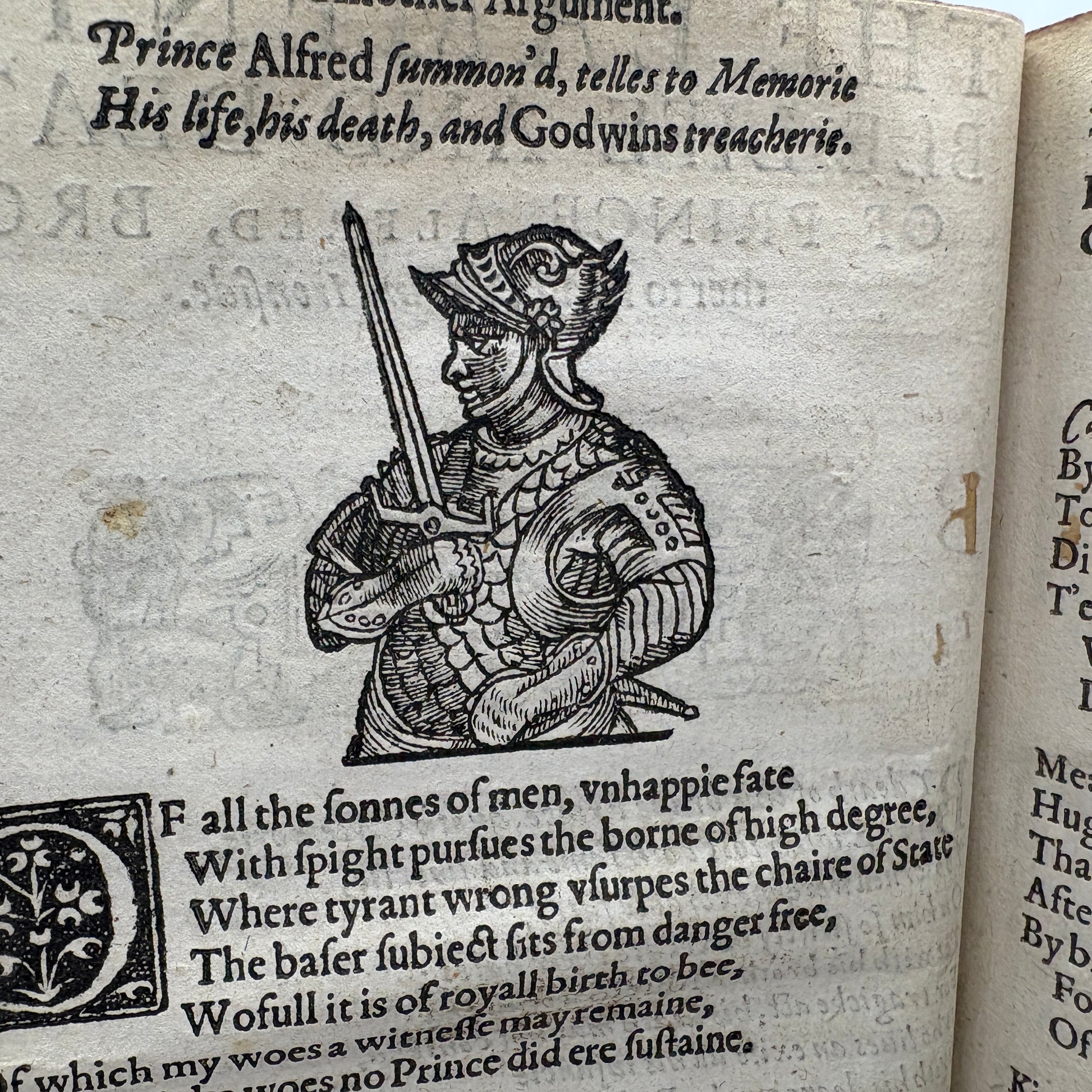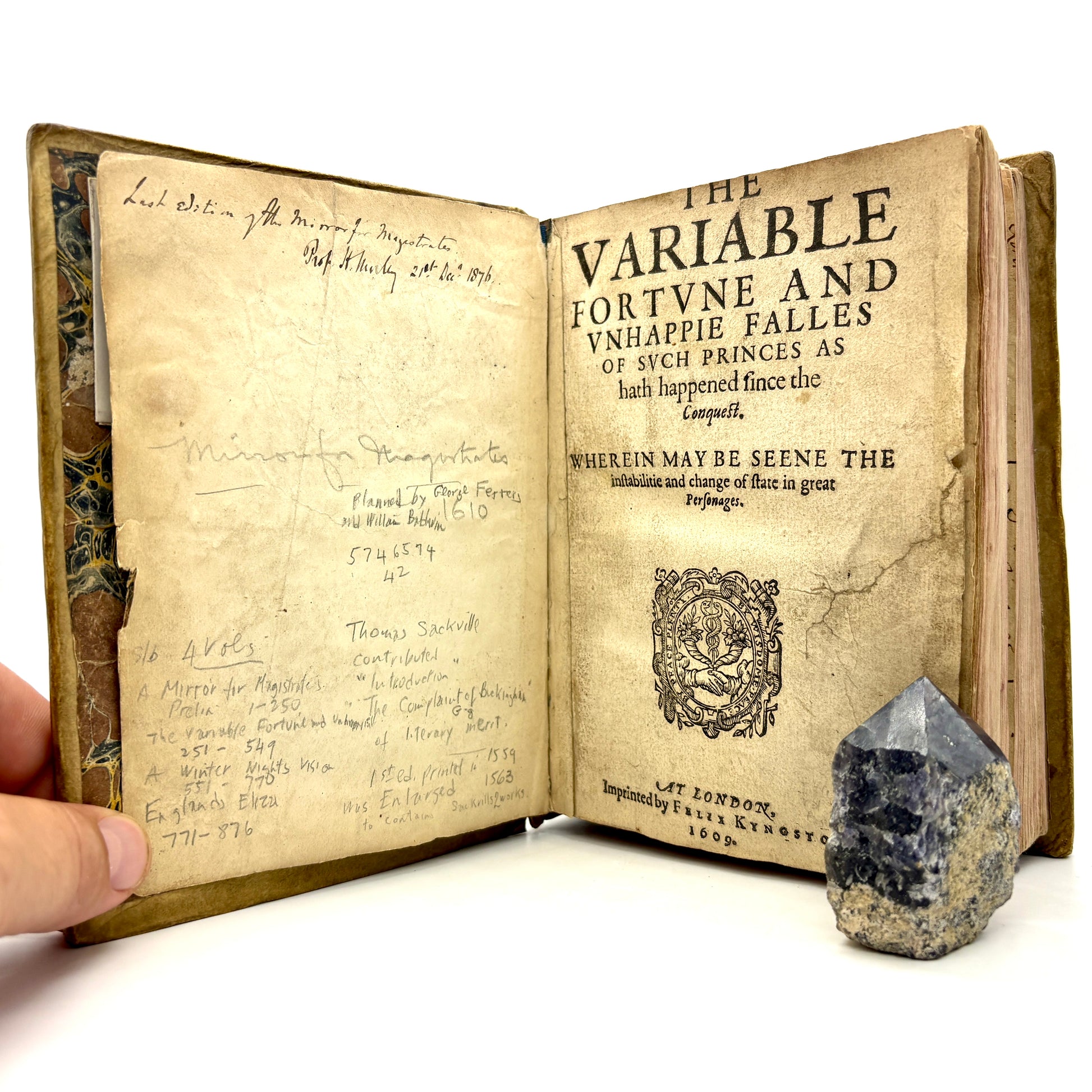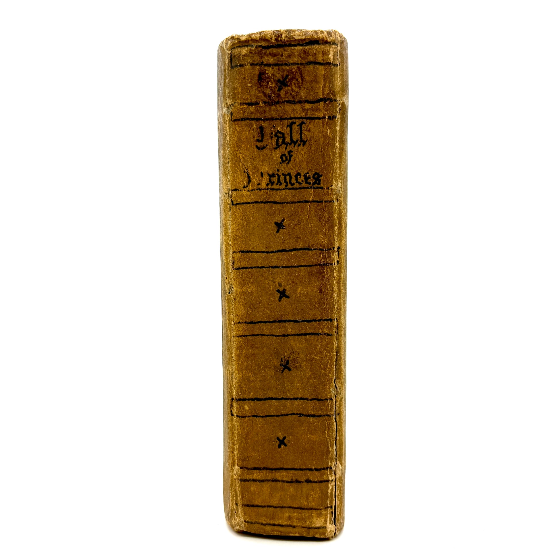 London: Felix Kyngston, 1609-1610. 6.75" x 5.25", 516pp with numerous woodcut illustrations of kings and historiated initials. Contemporary vellum with hand illustrated front/back board decorations and spine titling ("Fall of Princes"). Marbled endpapers. Heavily trimmed textblock with upper margin titles/page numbers removed. Annotations on page facing first title, occasional underlining, and some marginalia/doodling. Bookplate from USAFA library inside front cover, laid over an earlier, unidentified bookplate. Hinges have been repaired with binders tape. Externally worn, textblock with some missing page corners, occasional minor edge tears, and a handful of damp stains. All text appears to be present and legible. That being said, this copy has been bound in a unique order, covering 62 of the Mirror legends (see below for list) in an order all of its own. It contains title pages for parts of 2 and 3 of the Mirror, The Variable Fortune and Unhappie Falls of Such Princes as hath happened since the Conquest and A Winter Nights Vision: Being an Addition of Such Princes Especially Famous, who were exempted in the former Historie, as well as two Inductions. Good condition.