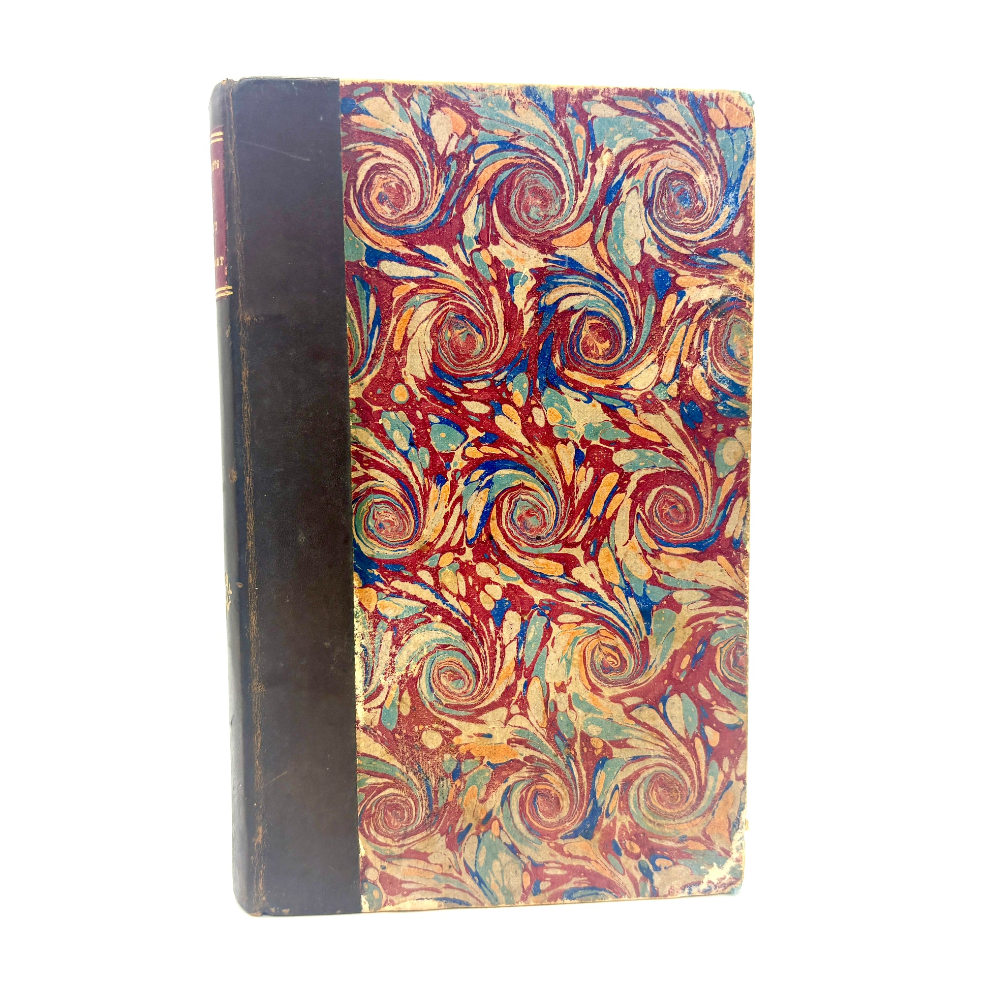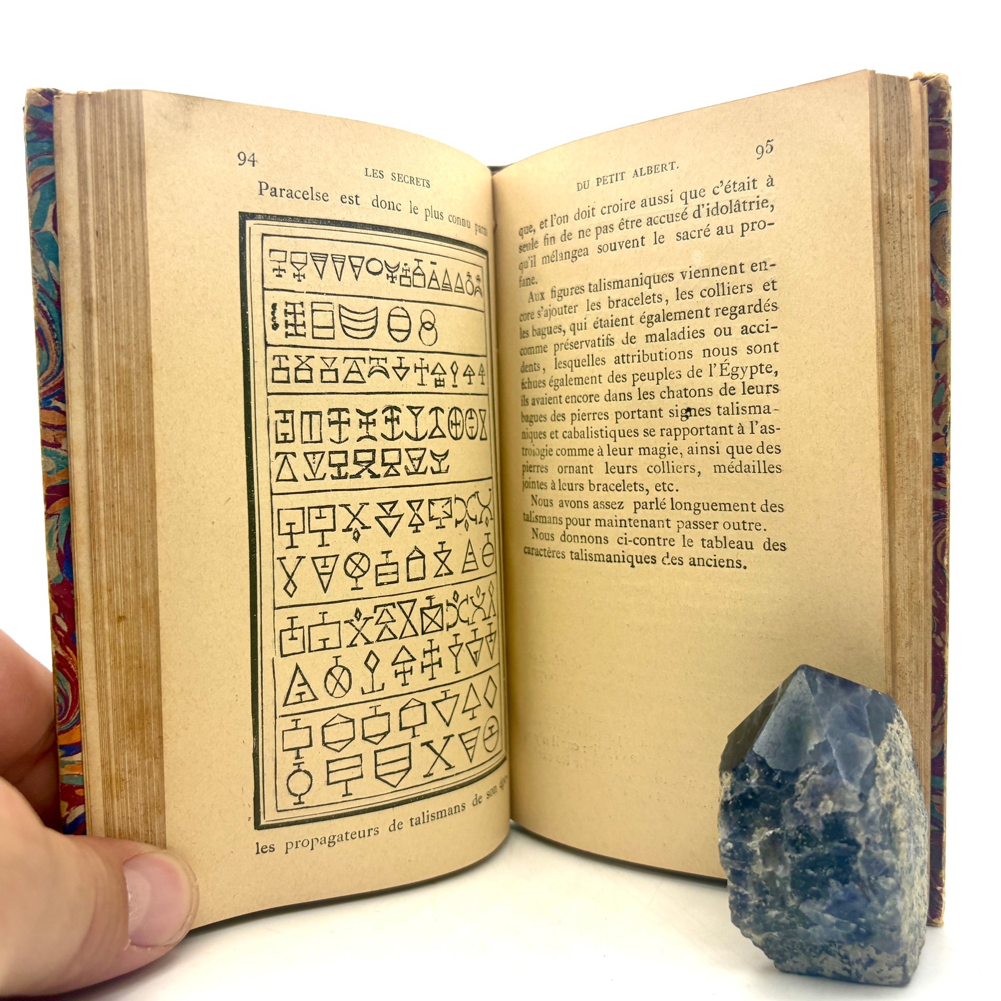 A classic 19th-century French grimoire in its widely circulated form, issued with the characteristic false Lyon imprint and archaic date. Long associated with folk magic and practical occult traditions, the Petit Albert was among the most popular handbooks of “natural magic,” blending astrology, talismanic diagrams, and recipes for charms and cures. This example, printed on wove paper and illustrated throughout with bold woodcuts—from talismanic tables to vivid allegorical scenes—captures the visual and practical appeal that made the text a staple of everyday occult practice. Surviving here in a striking period marbled binding, it remains as much an object of use as of curiosity.
