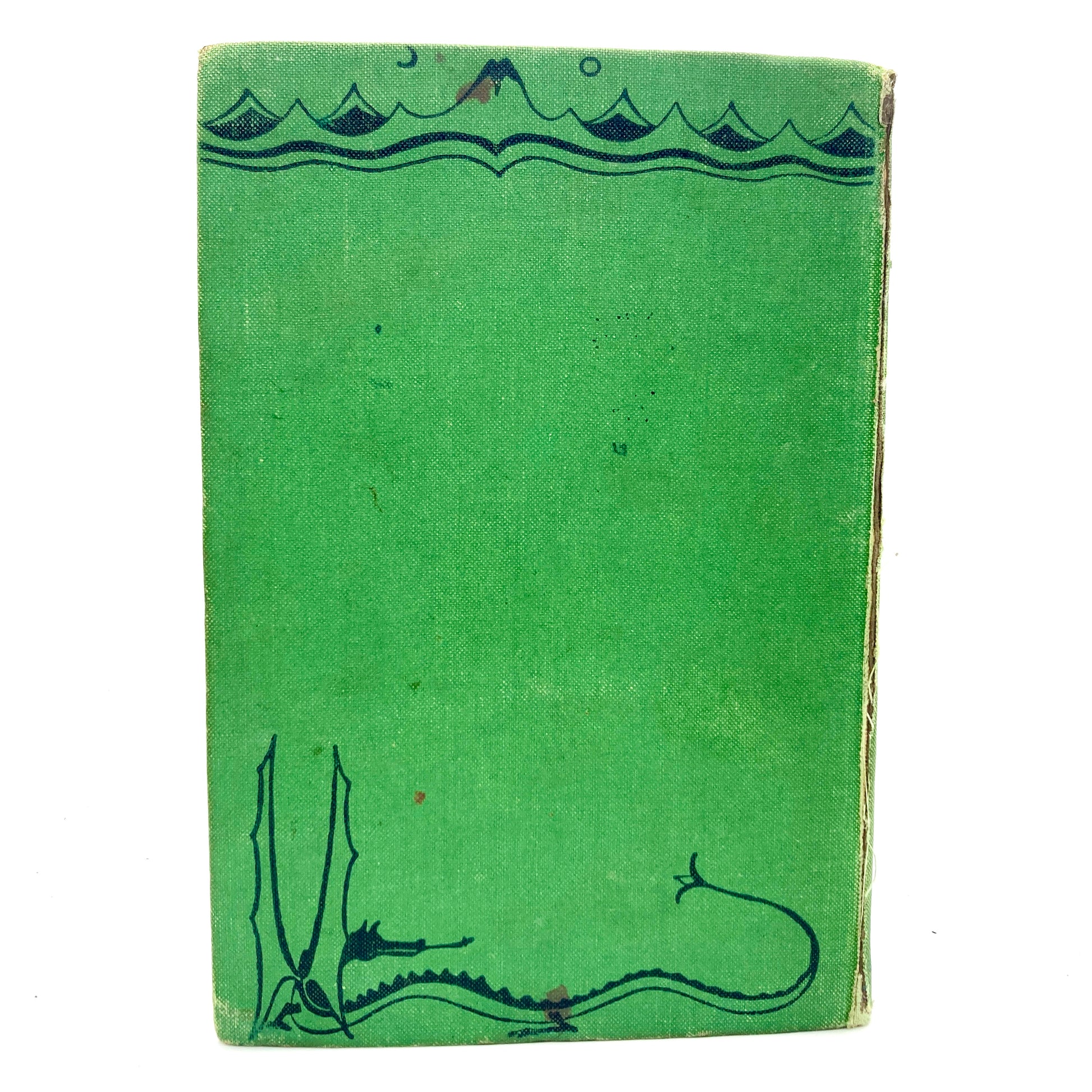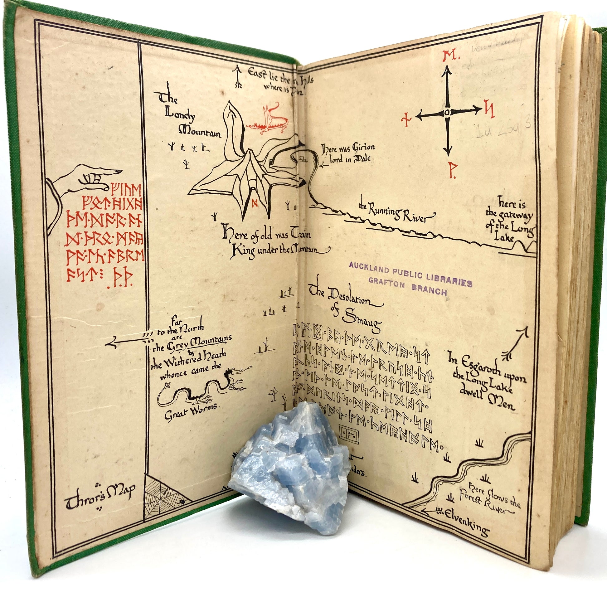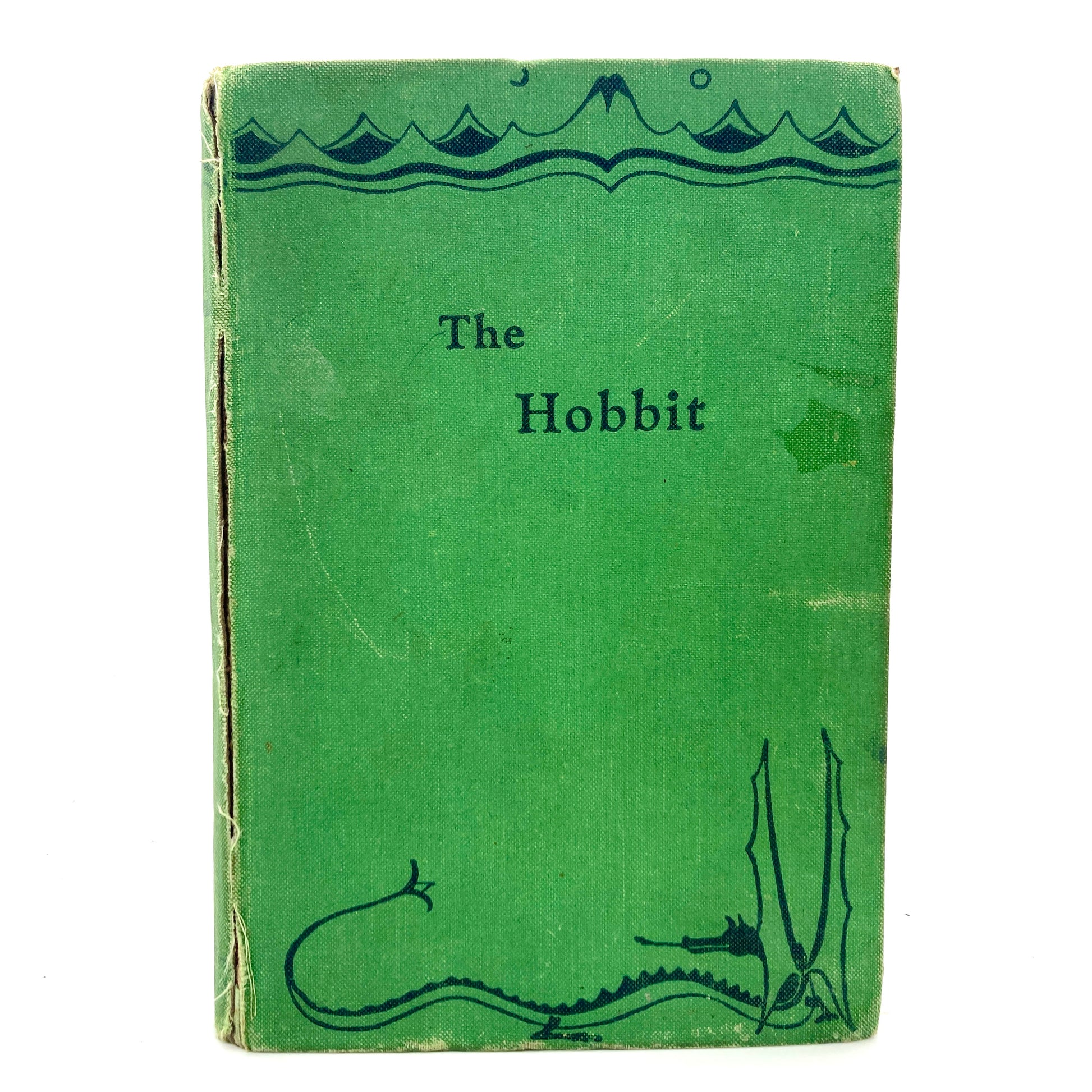"The Hobbit" by J.R.R. Tolkien [George Allen & Unwin Ltd., 1942]. First Edition, Third Printing. 310pp. Illustrated endpapers featuring maps of Middle-earth, frontispiece "The Hill: Hobbiton-across-the-Water" in color, and additional black-and-white illustrations throughout. Bound in green cloth with black lettering to spine and mountain and dragon motifs to boards. Ex-library copy lacking dust jacket. Moderate rubbing and soiling to spine with a couple of small ink stains; light bruising to corners and extremities; moderate sun-fading to spine and boards slightly cocked. Cracking to the cloth along the outer edges of the spine, with light fraying to spine ends. Two preliminary pages with closed tears near spine causing slight looseness. Light foxing and discoloration to pages and edges throughout. Library stamps and markings to endpapers, prelims, colophon, top of first page of text, and spine. Two fragments of original dust jacket pasted into blank prelims. Good.