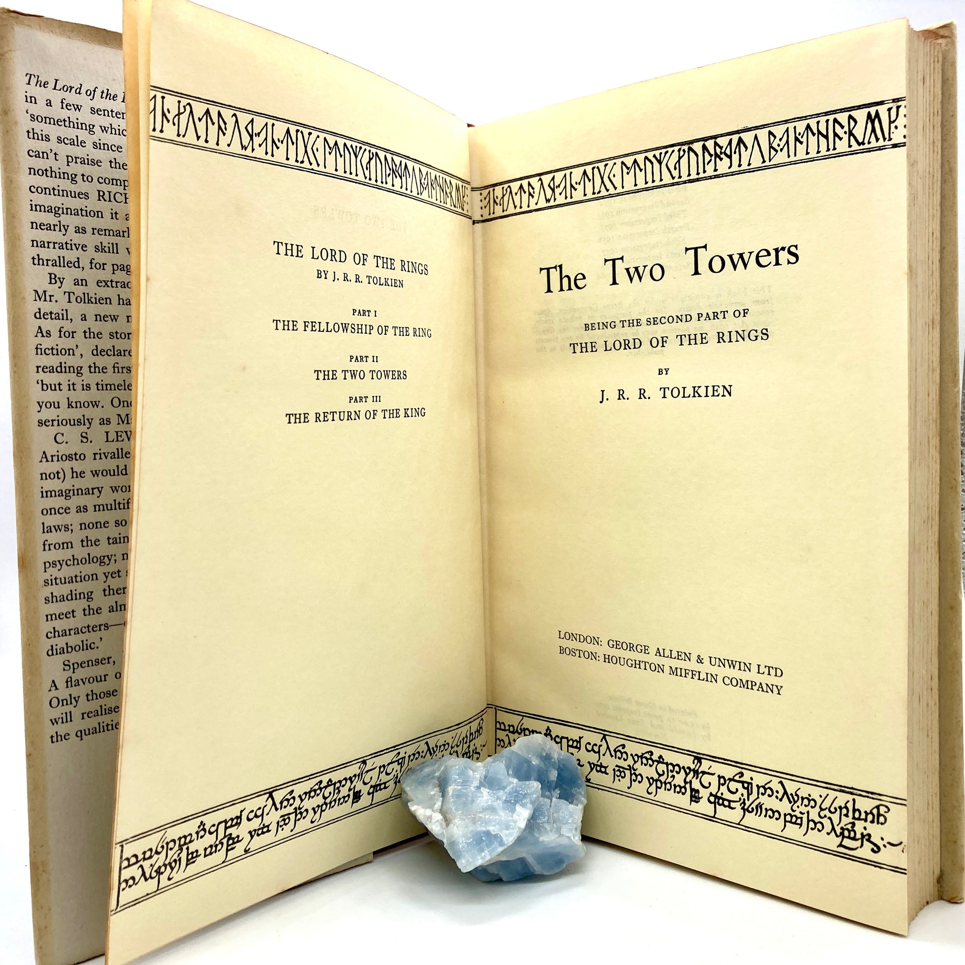 "The Two Towers" by J.R.R. Tolkien [George Allen & Unwin, 1960]. First edition, Seventh impression. 352pp. Cloth quite clean and spine gilt bright. Page edges and endpapers lightly foxed. Jacket discolored on spine face but panels both very clean. Very Good in Very Good- jacket.