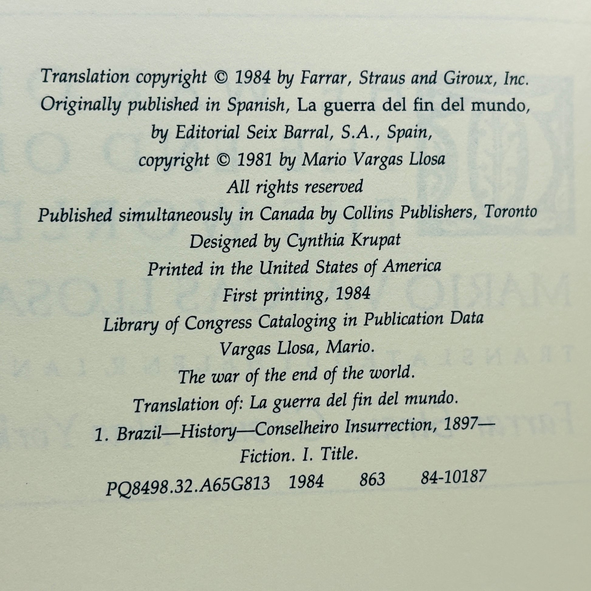 VARGAS LLOSA, Mario "The War of the End of the World" [1984] Signed 1st Printing